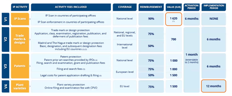 Refundacja wynosi 75 % kosztów urzędowych dla zgłoszeń znaków towarowych i wzorów przemysłowych na terenie UE i poszczególnych krajów członkowskich oraz 50 % poza UE, w trybie rejestracji międzynarodowych. Maksymalny zwrot opłat urzędowych wynosi 700 EUR.